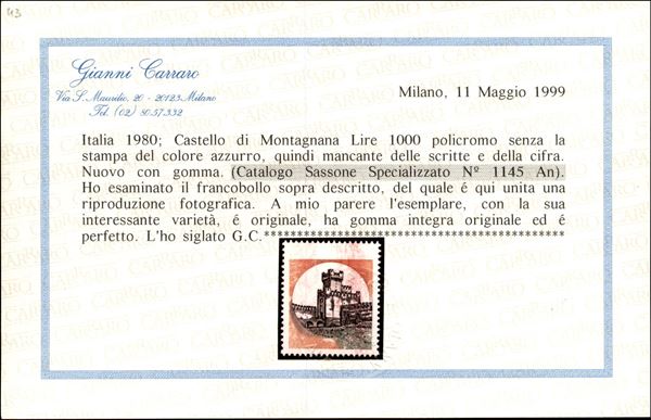 1980 - 1000 lire Montagnana (1145 Specializzato) senza stampa dell'azzurro e leggera impressione in rosso delle diciture e del valore (spostate in verticale) - gomma integra - cert. Carraro