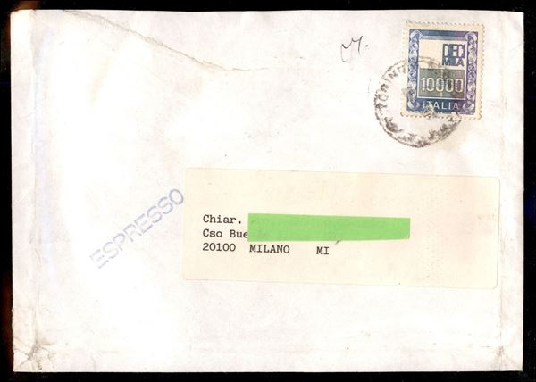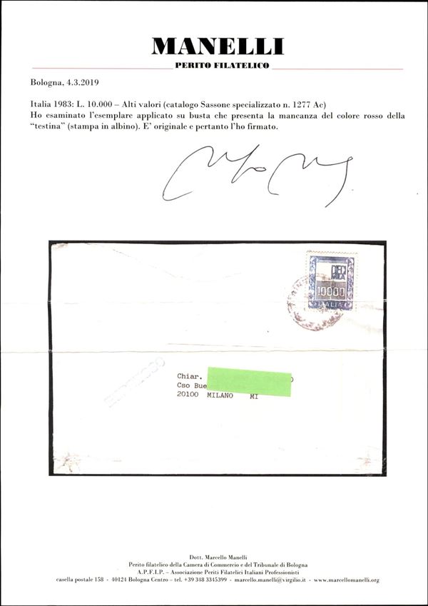 1983 - 1000 lire Alti Valori (1442A) senza stampa del rosso e testina mancante (Spec. 1277Ac) usato su busta - cert. Mannelli