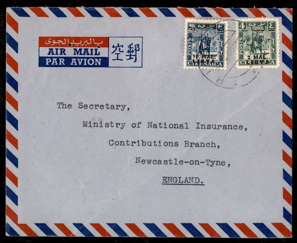 2 mal su 4 m. + 10 mal su 20 m. (25 + 29) su aerogramma da Tripoli a Newcastle (Inghilterra)