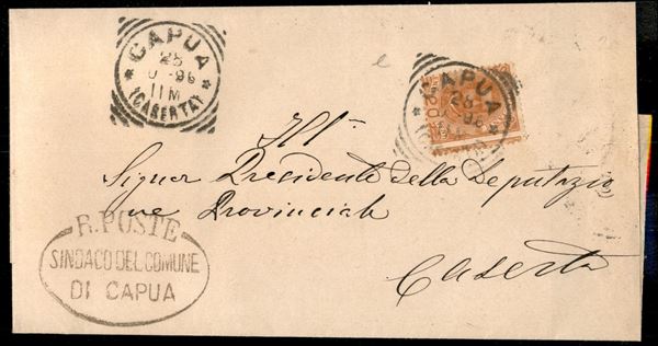 20 cent con dentellatura verticale fortemente spostata a destra e parte del vicino (61 var.) su lettera da Capua per Caserta del 28.10.96