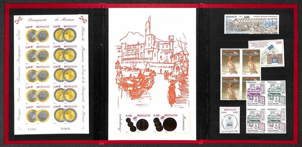 2002 - Folder omaggio del Principe ai partecipanti all'Esposizione Monacophil - sette prove dell'emissioni 1999/2002 - gomma integra