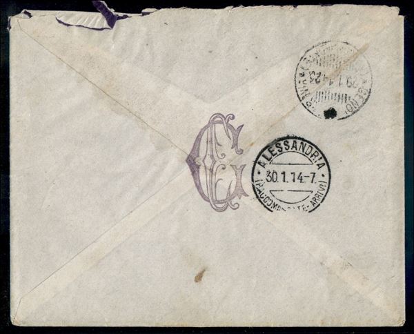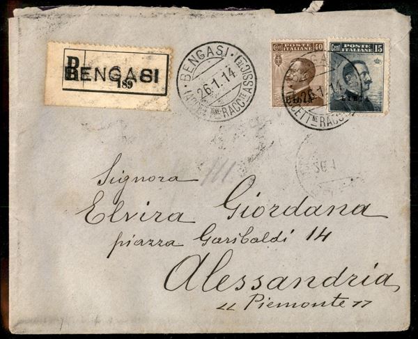 40 cent (8) + 15 cent (5) - raccomandata da Bengasi a Alessandria del 26.1.1914