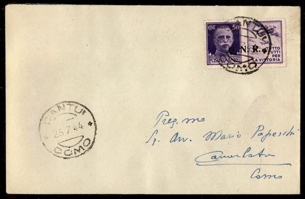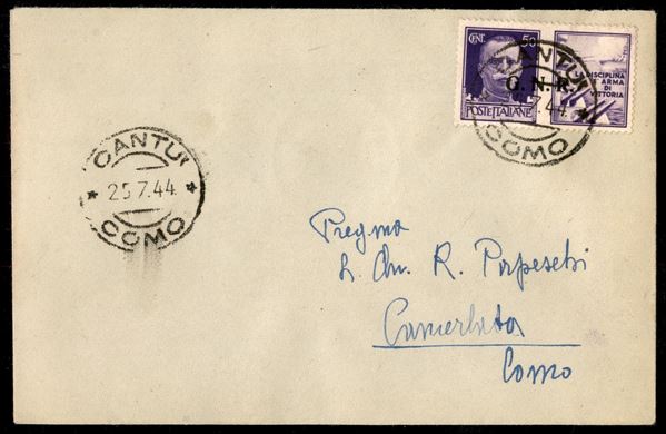 50 cent Propaganda - Marina (21/II) + Esercito (22/II) + Aviazione (23/II) + Milizia (24/II) - serie completa - 4 valori in uso singolo su buste da Cantù a Como del 25.7.44