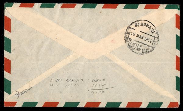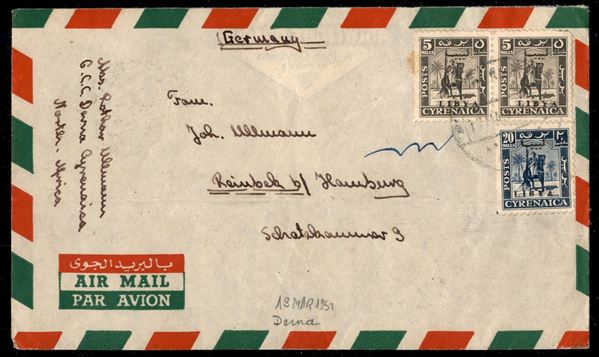 Aerogramma affrancato con coppia del 5 mills (5) + 20 mills (9) da Derna a Amburgo del 18.3.52