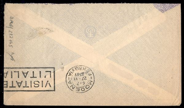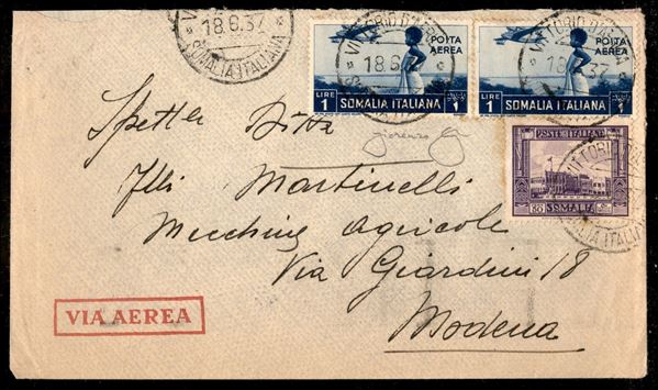 Aerogramma affrancato per 2,50 lire (221 + coppia 21) da Vittorio d'Africa (Somalia Italiana) a Modena del 18.6.37 - raro aerogramma - cert. Longhi