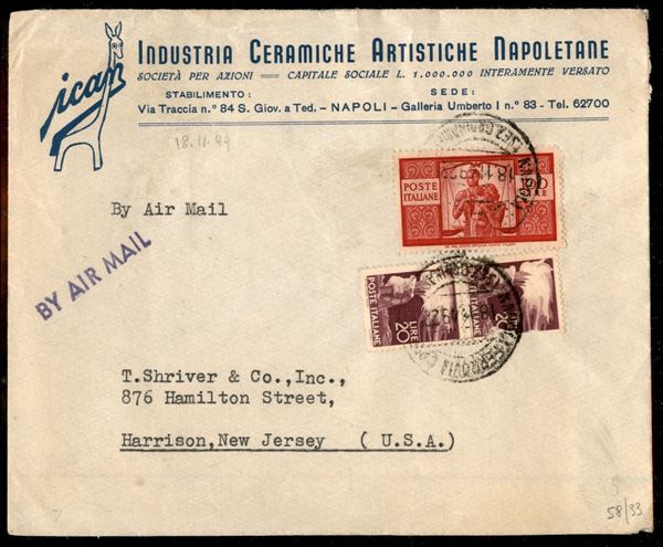 Aerogramma con 100 lire Democratica (565) + complementare (561) da Napoli a Harrison (USA) del 18.11.49