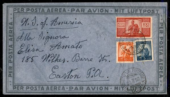 Aerogramma con 100 lire Democratica (565) + complementari 10 lire + 5 lire (555 + 559) da Foggia a Easton (USA) del 20.7.50