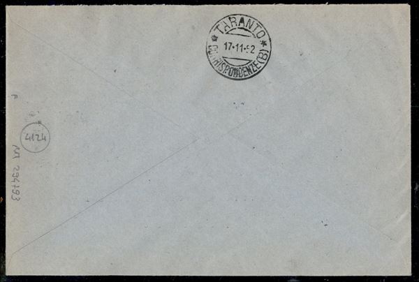 Affrancatura mista per 76 lire con Democratica + Italia al Lavoro + Forze Armate (547 + tre 550 + 553 + tre 634 + 636 + 648 + 699) su busta da Mezzolombardo a Taranto del 14.11.52 - rara combinazione oltre a valori gemelli anche per tariffa - molto bella