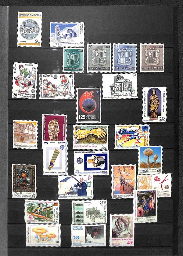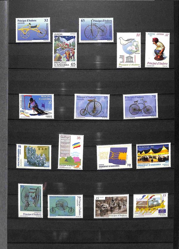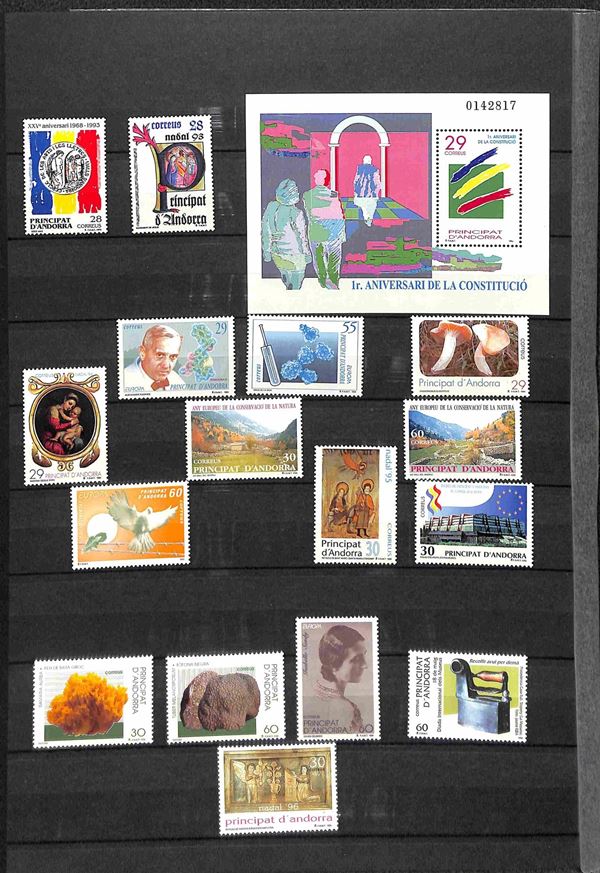ANDORRA SPAGNOLA - 1988/1999 - Piccolo insieme di valori nuovi del periodo - serie complete e foglietti montati su 2 pagine di raccoglitore - gomma integra