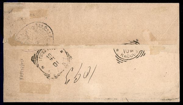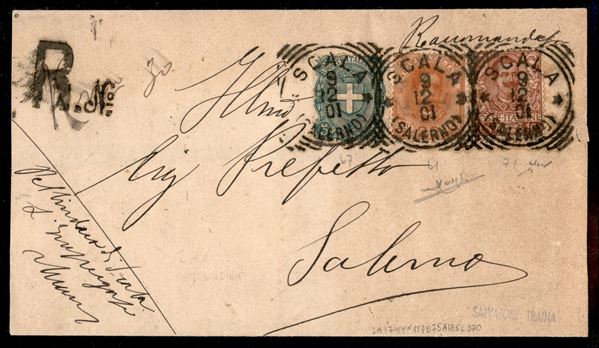 Bella tricolore mista due Re - 5 cent + 20 cent Umberto I + 10 cent Floreale (61 + 67 + 71) su involucro raccomandato da Scala (Salerno) a Salerno del 9.12.01 - tariffa ridotta - Raybaudi