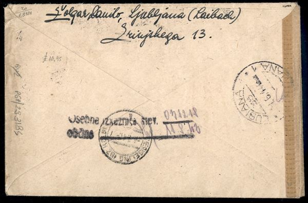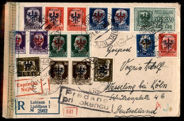 Bellissima affrancatura per 10,95 lire di valori soprastampati di posta Ordinaria e Espresso (1 + due 4 + due 5 + due 6 + 7 + due 8 + 9/10 + due 11 + 14 + espresso 32) su busta raccomandata da Lubiana a Wesseling del 21.6.44 - Raybaudi