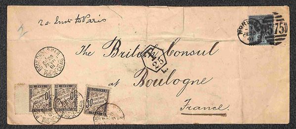 Busta affrancata con 2 1/2 pence (89) da Norvich a Boulogne del 25.2.91 e qui tassata per 50 cent (Francia)