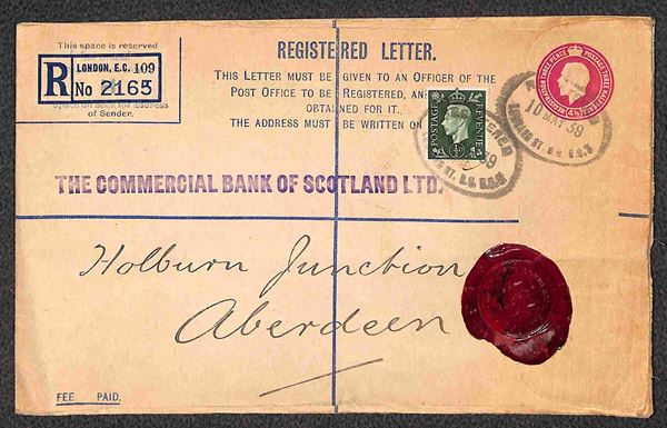 Busta postale raccomandata (Giorgio) con complementare (Edoardo) da Londra a Aberdeen del 10.5.1939