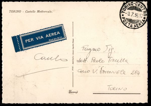 Cartolina affrancata al recto con 1 + 1 lira Posta Aerea + 20 cent Orazio (399 + 98) per cittą - Torino 9.7.36