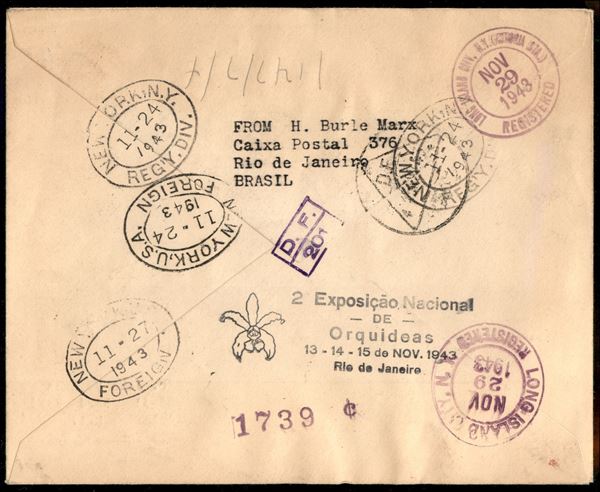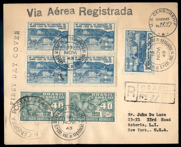 Coppia del 40 cent Rodrigues (647) + complementari (646 + 646 quartina) su aerogramma raccomandato FDC da Rio a New York del 13.11.43 nel giorno d'emissione