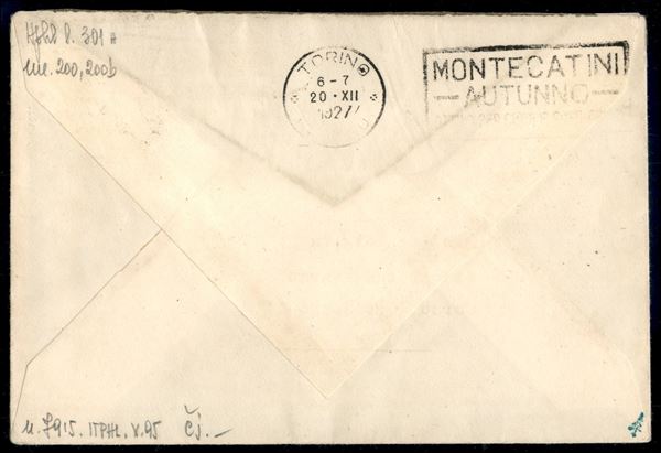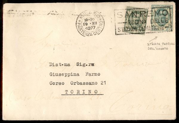 Due 25 cent Floreale (200 + 200b) uno con stampa parziale dell'ornato - busta da Milano a Torino del 19.12.27 - ex coll. Provera
