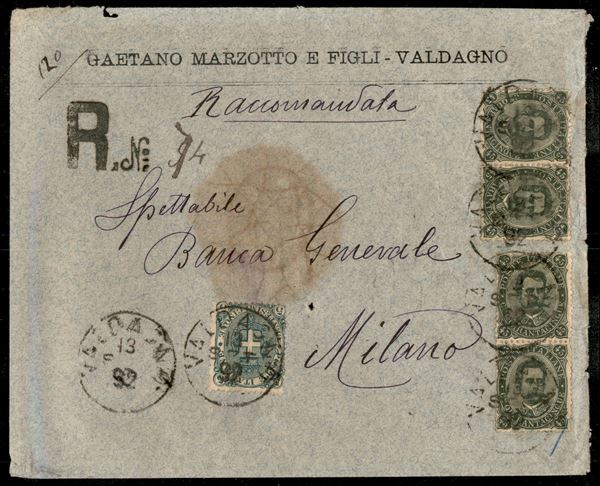 Due raccomandate 45 cent (46) - una di sei porti con blocco di tre a seggiola + 10 cent e l'altra di otto porti con due coppie + 5 cent - entrambe da Valdagno per Milano del sett./dic. 1892