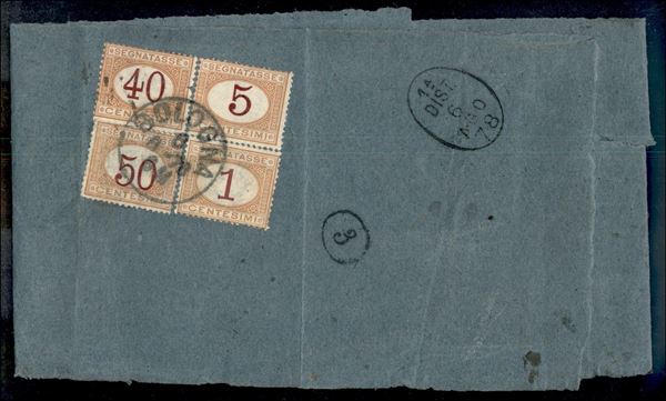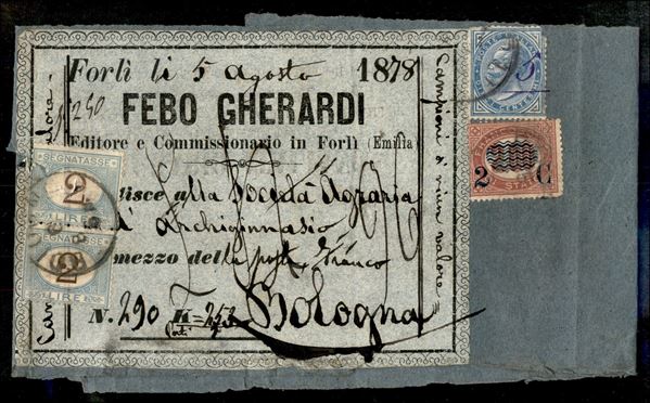 Fascetta Campione Senza Valore spedito dall'Editore Febo Gherardi affrancata con 10 cent + 2 cent su 2 lire (27 + 34) e tassata in arrivo a Bologna per lire 4,96 con 1 cent +5 cent + 40 cent + 50 cent + coppia 2 lire con un valore difettoso (3 + 5 + 8 + 9 + 12) - combinazione molto rara
