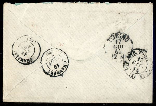 Frode Postale - Coppia del 20 cent su 15 (23) con tracce di annullo precedente a sinistra - bustina da Ferrara a Chambery del 16.6.1865