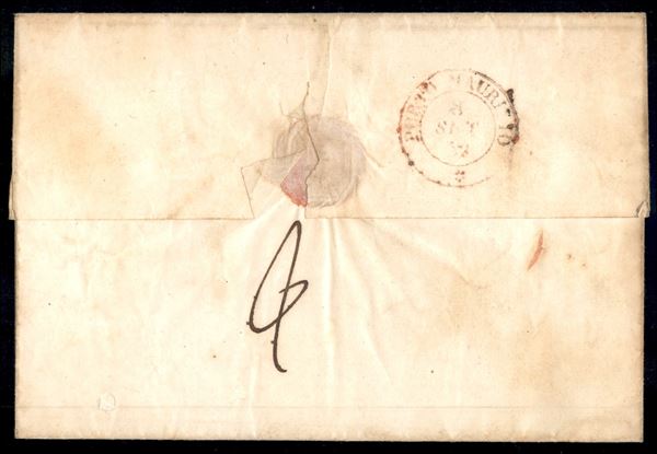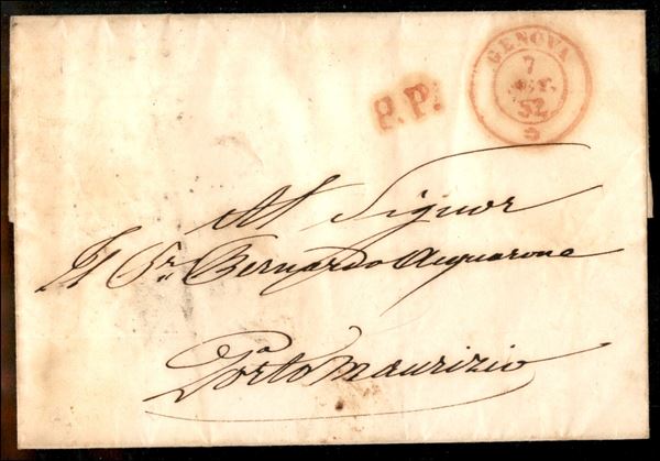Genova (doppio cerchio) + P.P. (entrambi in rosso) - lettera per Porto Maurizio (doppio cerchio rosso in arrivo al retro) del 7.9.52