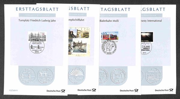 GERMANIA - 1975/2014 - Accumulazione del periodo di ERSTTAGSBLAT dei valori emessi negli anni tutti ancora nelle buste delle poste tedesche il tutto in una scatola - da esaminare