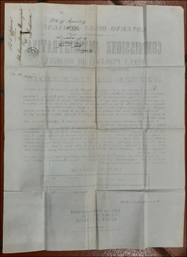 Governo delle Romagne - Bologna 24 agosto 1859 - Avviso di Vigesima - intero manifesto per Medicina - 1 di tassa