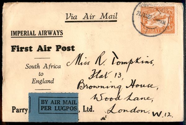 Imperial Airways - Aerogramma del Primo Volo Sud Africa Inghilterra - 1 sh (C6) - Johannesburg 27.1.32 - bella busta stampata