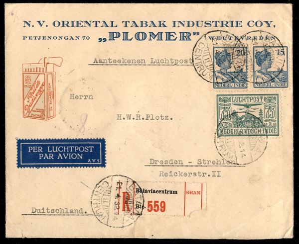 Indie Olandesi - Sigarette Plomer - aerogramma raccomandato da Batavia a Dresda del 21.4.32