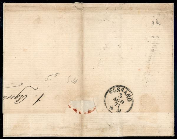 Lettera da Roma per Fossano del 1 ago. 71 con 60 cent + 25 cent (21 + 26) annullati con bollo muto sperimentale a rombi