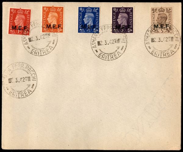 MEF - Tiratura del Cairo - Cinque valori (1/5) usati su busta FDC nel giorno d'emissione il 2 marzo 1942