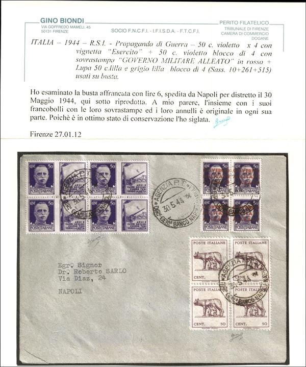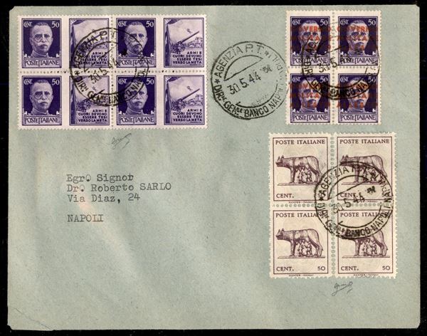 Quartina del 50 cent soprastampato (12) + quartina del 50 cent Propaganda di Regno (10) + quartina del 50 cent Lupa (515) su busta - Napoli 30.5.44 - cert. Biondi