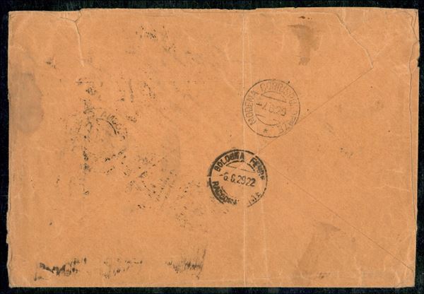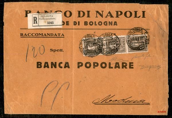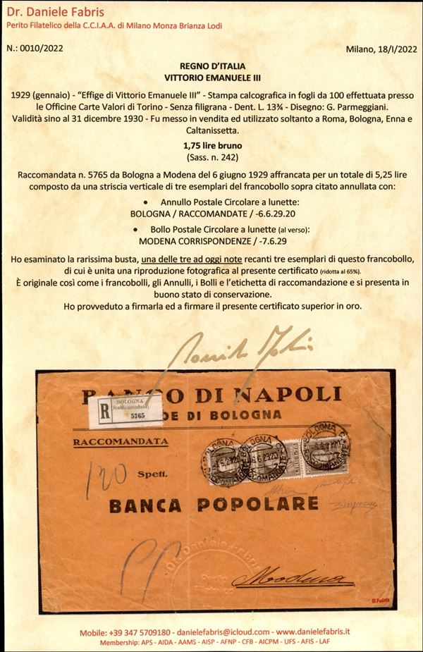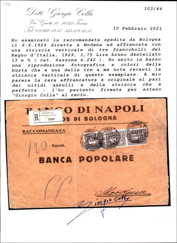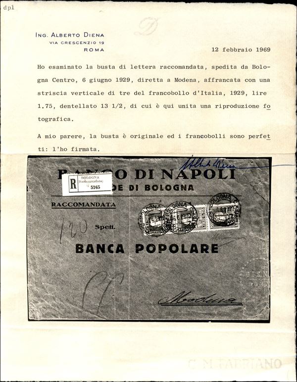 Raccomandata affrancata con striscia del 1,75 lire bruno (242) dentellato 13 3/4 da Bologna a Modena del 6.6.29 - una delle tre note recanti la striscia verticale di questo valore - molto rara - cert. A. Diena + cert. Colla + cert. Fabris