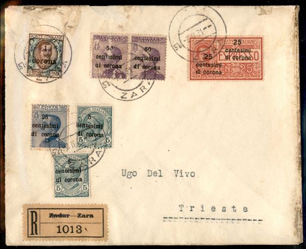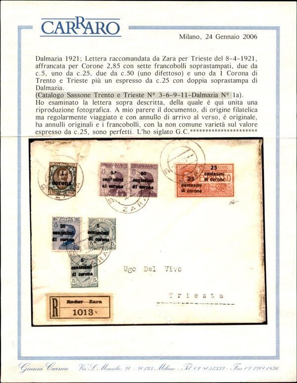 Raccomandata affrancata con valori di ordinaria e espresso per 2,60 corone (3 + 6 + due 9 + 11 + Espresso 1a) da Zara a Trieste del 8.4.21 - espresso con doppia soprastampa diagonale - cert. Carraro
