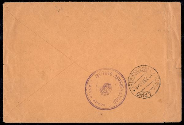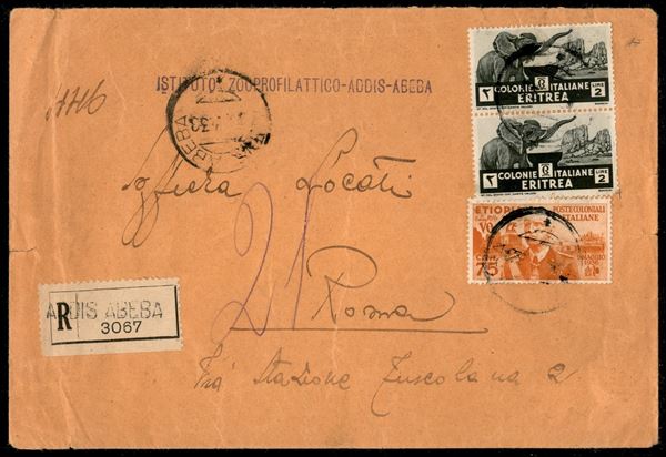 Raccomandata sei porti da Addis Abeba per Roma del ...7.33 con 75 cent (6) + coppia 2 lire (Eritrea 210) - minimi difetti su un valore da 2 lire