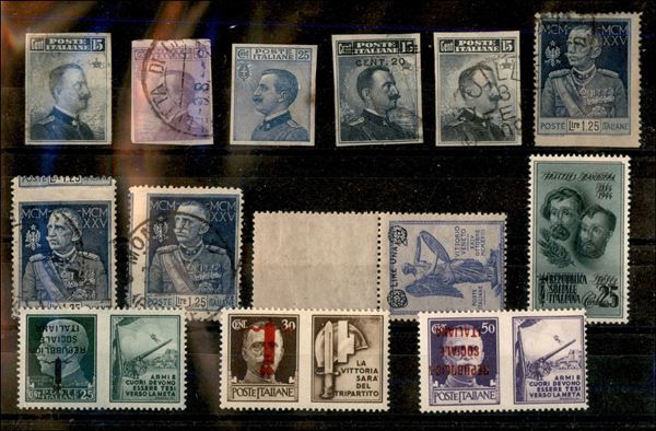REGNO/RSI - 1906/1944 - Insieme di 13 valori nuovi e usati del periodo con interessanti varietà montati su un cartoncino - non dentellati doppia stampa e soprastampa capovolta - da esaminare