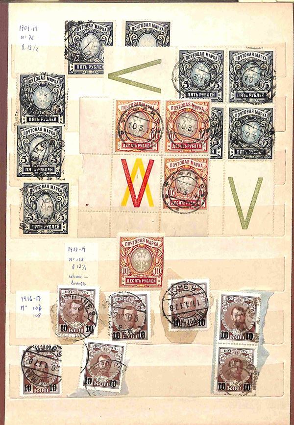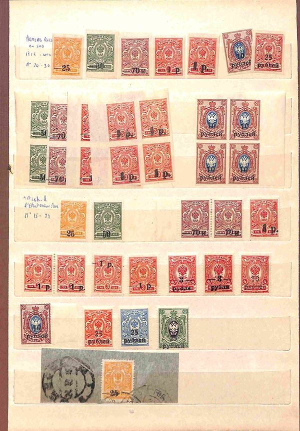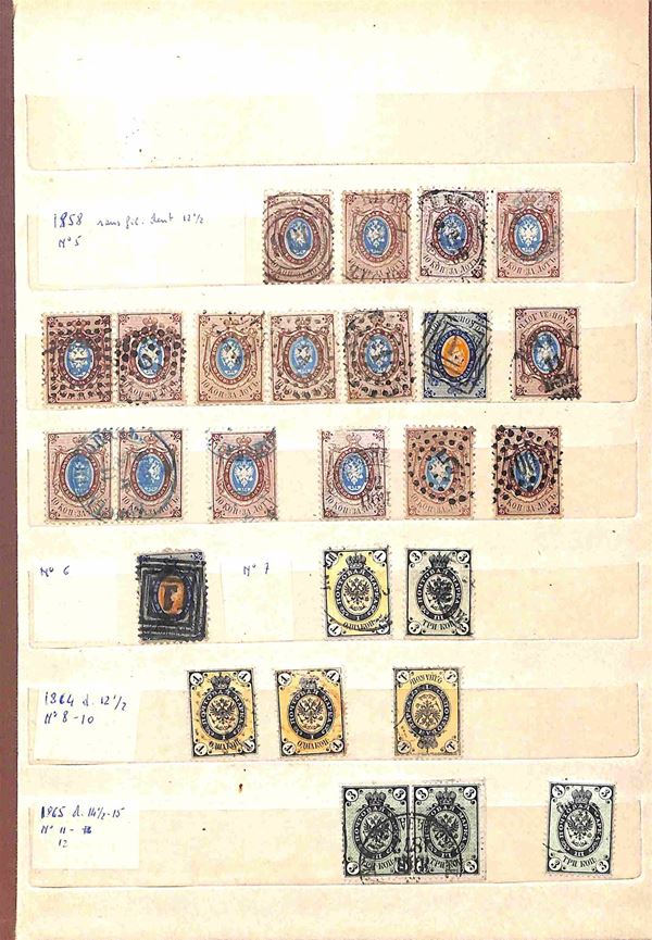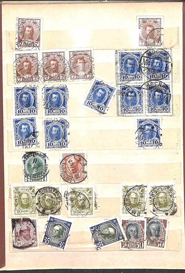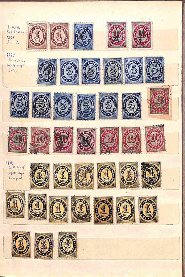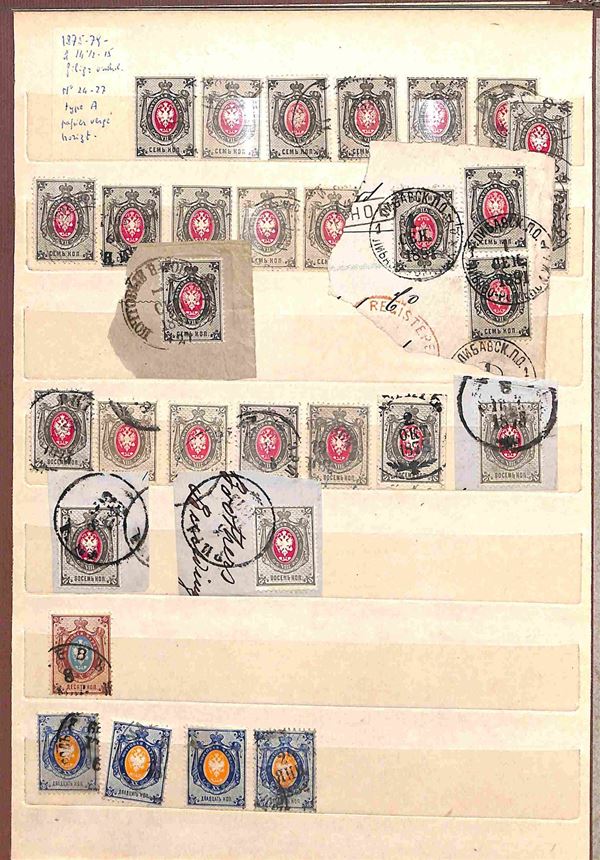 RUSSIA - 1858/1919 - Collezione studio delle emissioni del periodo con valori prevalentemente usati in 2 classificatori - insieme molto interessante con diversi valori del primo periodo compresi due grandi blocchi nuovi pił una buona parte di occupazioni - completa il lotto album con valori usati recenti - merita esame