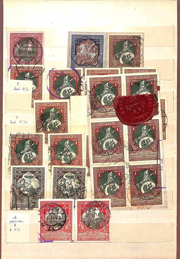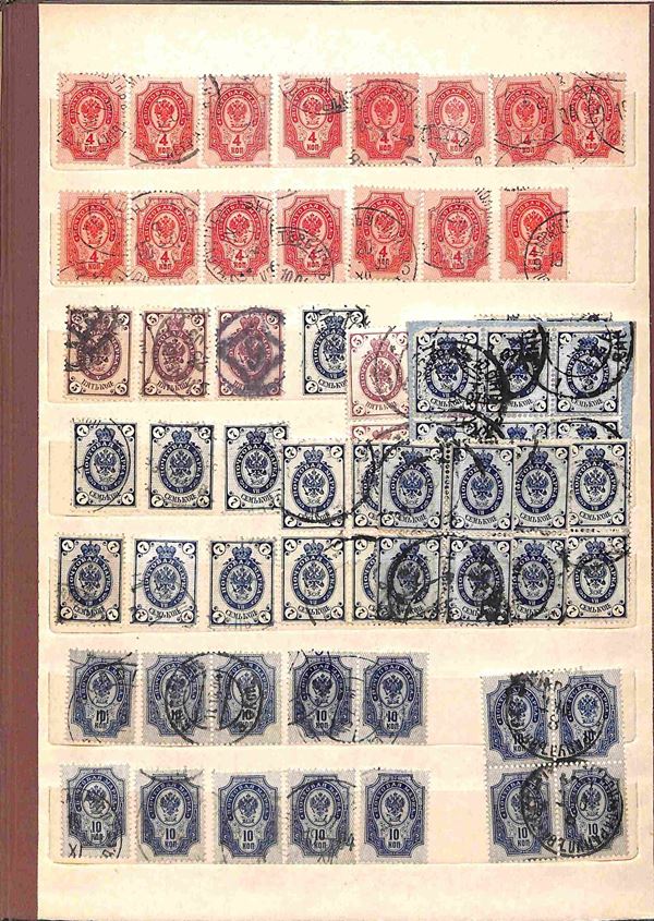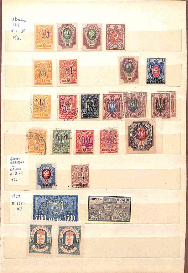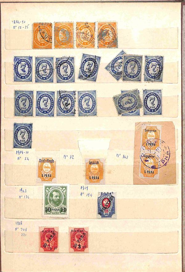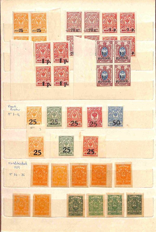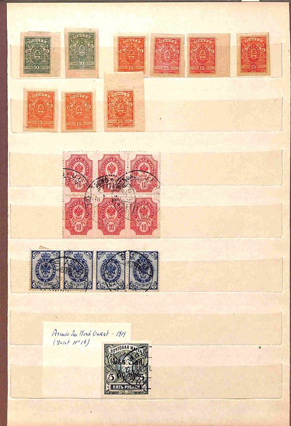 RUSSIA - 1858/1919 - Collezione studio delle emissioni del periodo con valori prevalentemente usati in 2 classificatori - insieme molto interessante con diversi valori del primo periodo compresi due grandi blocchi nuovi pił una buona parte di occupazioni - completa il lotto album con valori usati recenti - merita esame