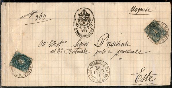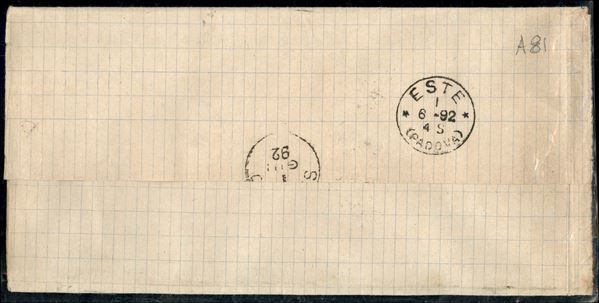 Valori Gemelli - 5 cent fondo unito + 5 cent fondo a linee (44 + 59) su sovracoperta da Santa Margherita d'Adige per Este del 1 giu. 92
