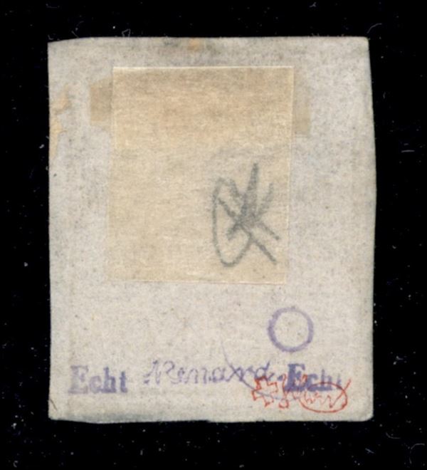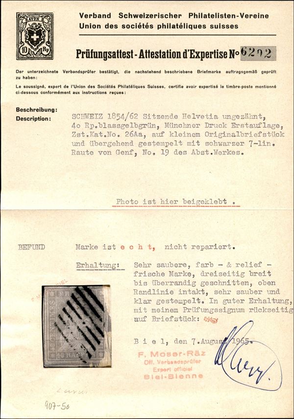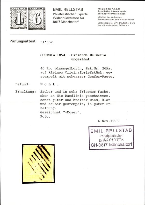 1854 - 40 Rappen (Michel 17 I Zst. 26Aa) carta sottile della prima tiratura - usato su piccolo frammento - cert. Moser + cert. Rellstab