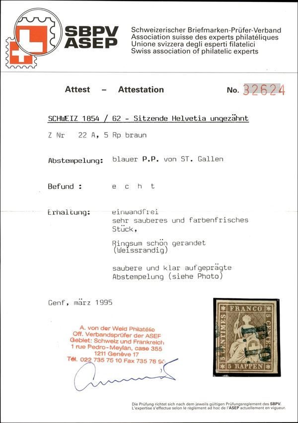 1854 - 5 Rappen (Michel 13 Zst 22A) - annullato P.P. - molto bello - cert. Weld