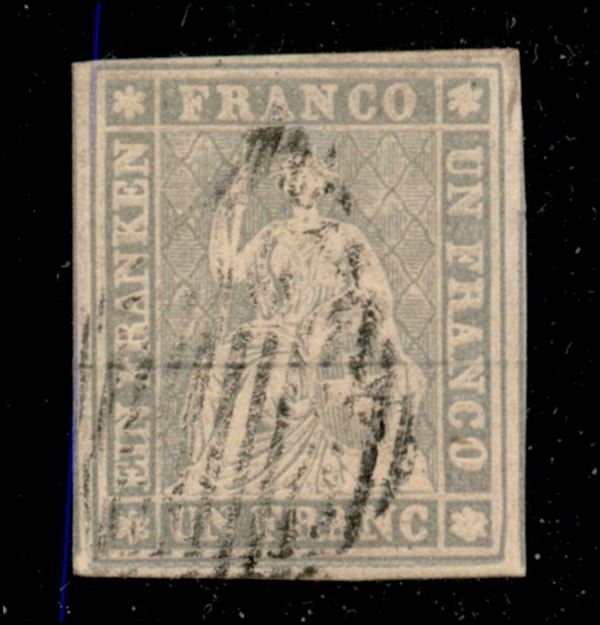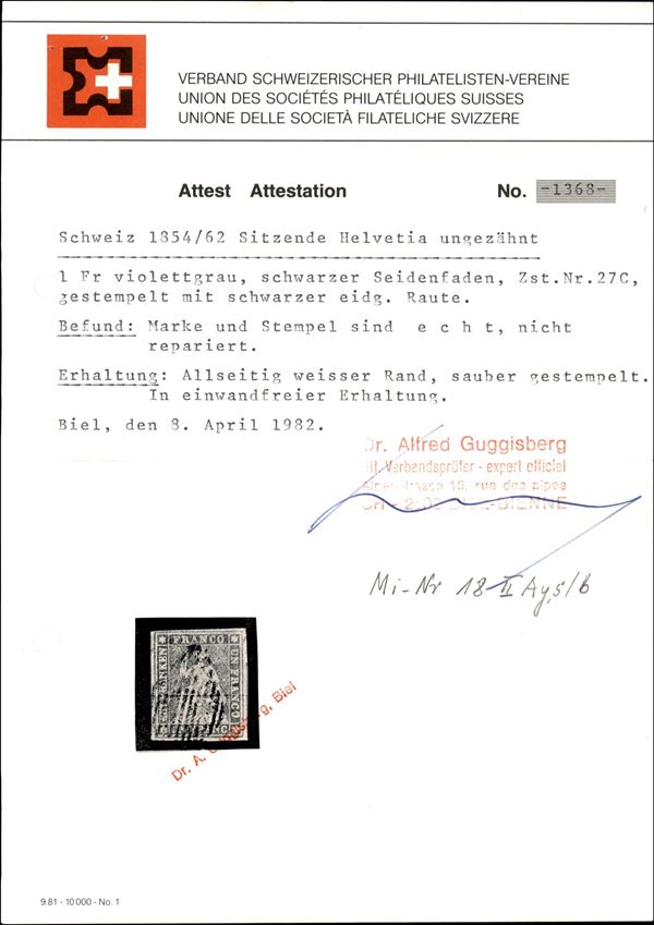 1854/62 - 1 franco (Michel 18 II Zst. 27C) - usato - molto bello - cert. Guggisberg