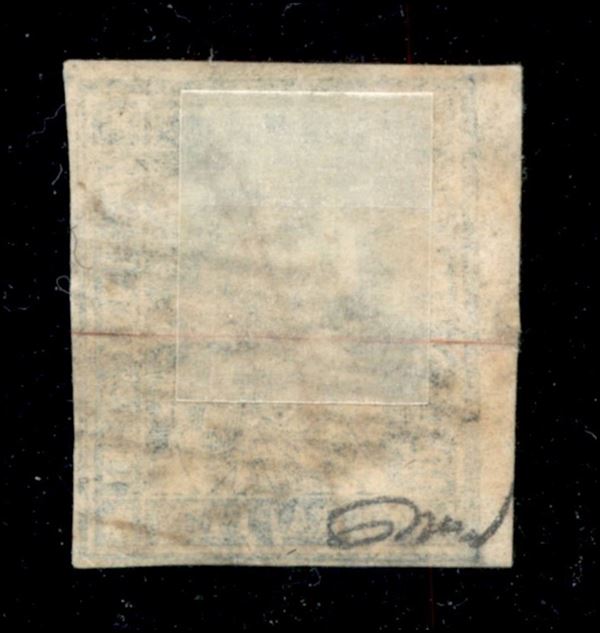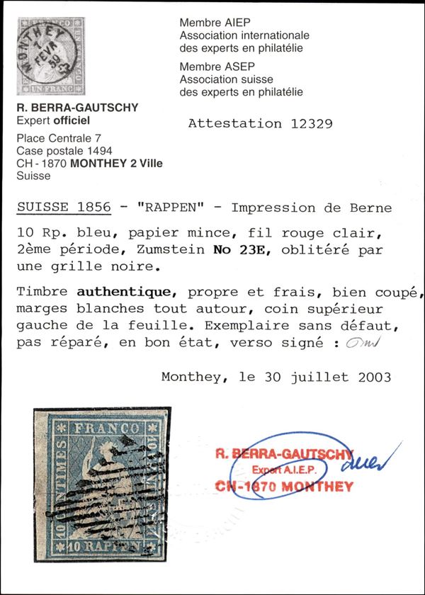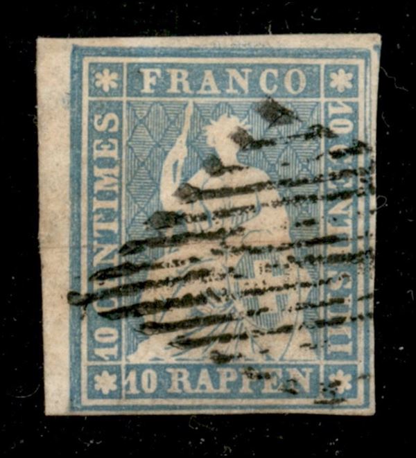 1856 - 10 Rappen blu (Michel 14 II var Zst. 23E) angolo di foglio sinistro - usato - molto bello - cert. Gantschy