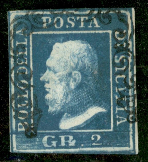 1859 - 2 grana cobalto (6b - prima tavola) - grandi margini - usato - molto bello