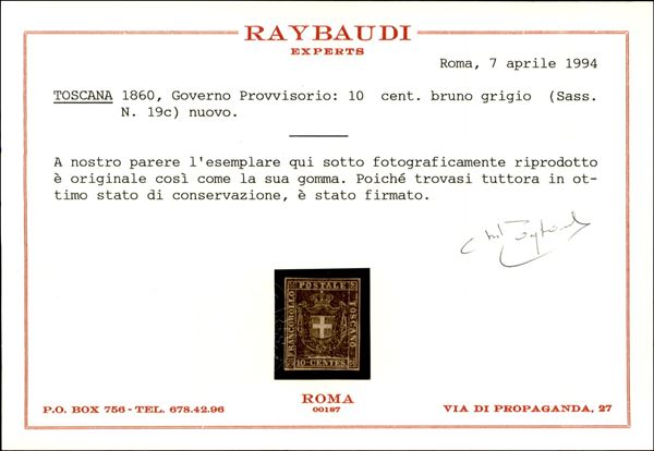 1860 - 10 cent bruno grigio (19c) - gomma originale - splendido - Emilio Diena + Cert. Raybaudi