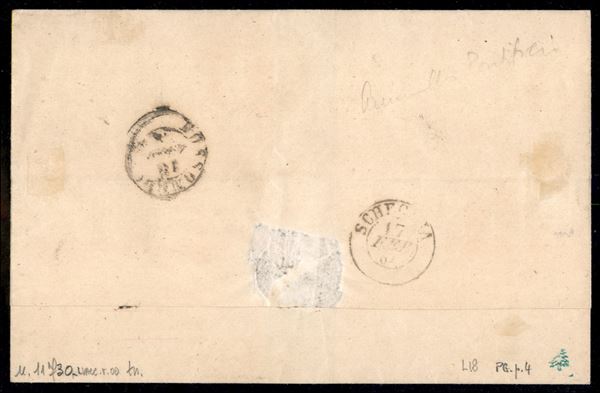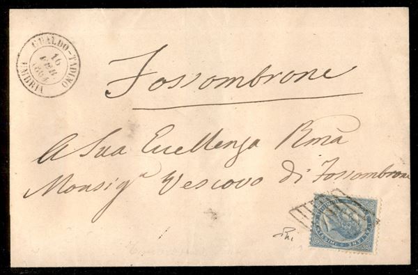 1863 - 15 cent celeste chiaro (L18) su lettera con griglia annullatrice da Gualdo Tadino 16.2.61 a Fossombrone via Scheggia - Vaccari - ex coll. Provera