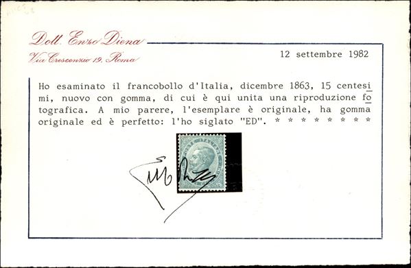 1863 - 15 cent De La Rue (L18) - ottimamente centrato - gomma originale - cert Em. Diena
