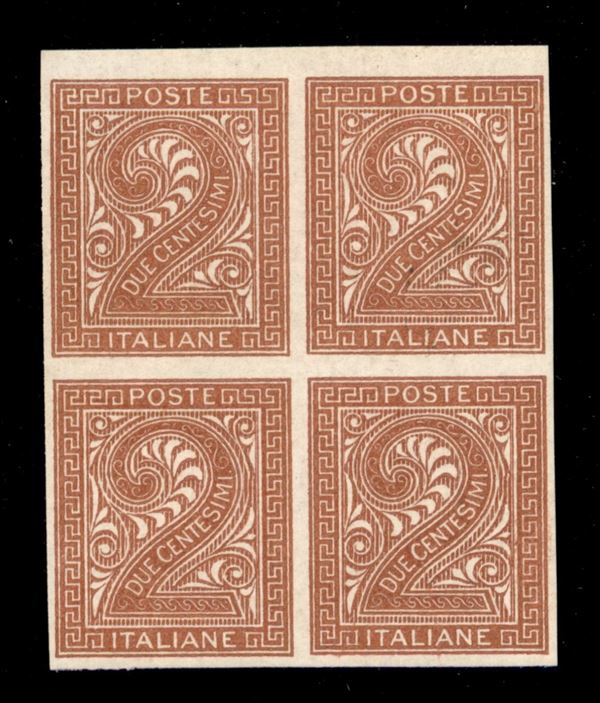1863 - Torino - Prove d'Archivio - 2 cent rosso mattone (P15) in quartina bordo foglio - carta spessa + gomma bianca - gomma integra - A. Diena