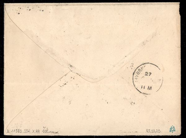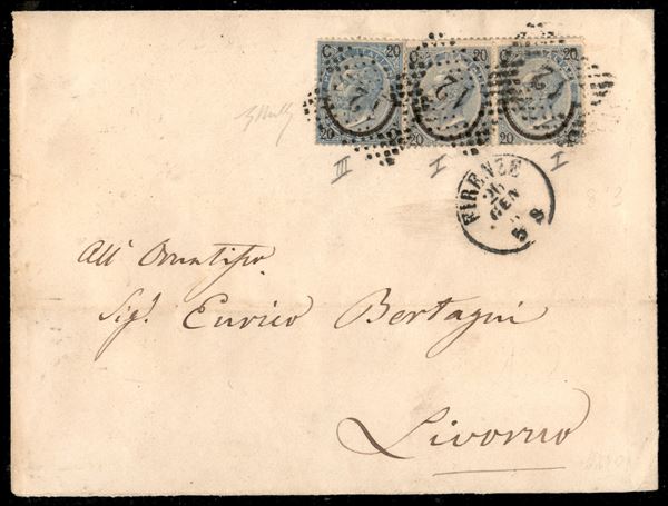 1865 - 20 cent su 15 cent celeste chiaro I tipo (23) in coppia + 20 cent su 15 cent celeste III tipo (25) in affrancatura mista su busta da Firenze a Livorno - ex coll. Provera