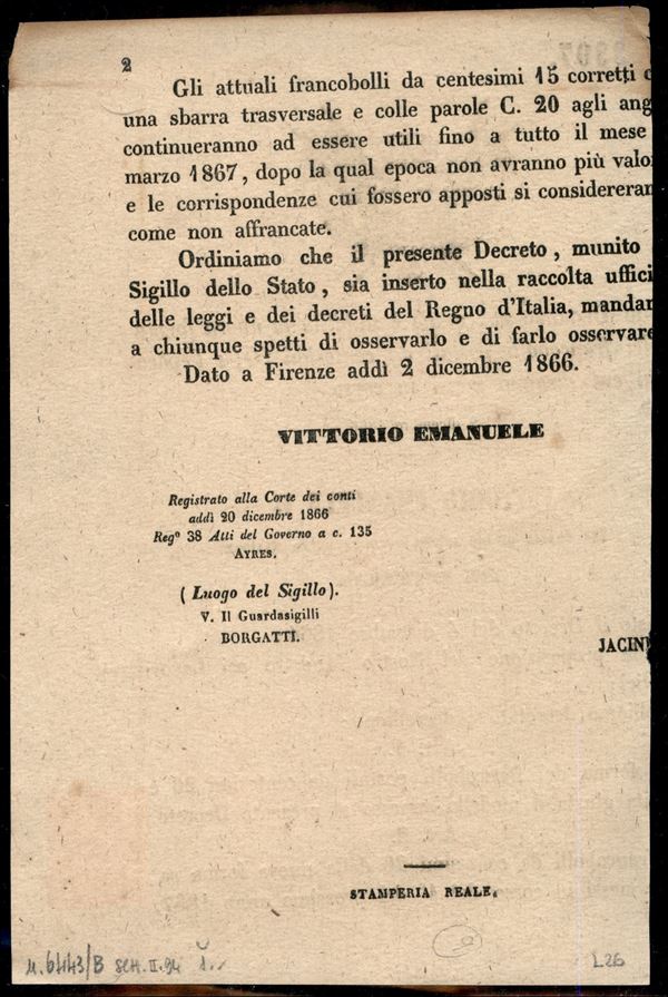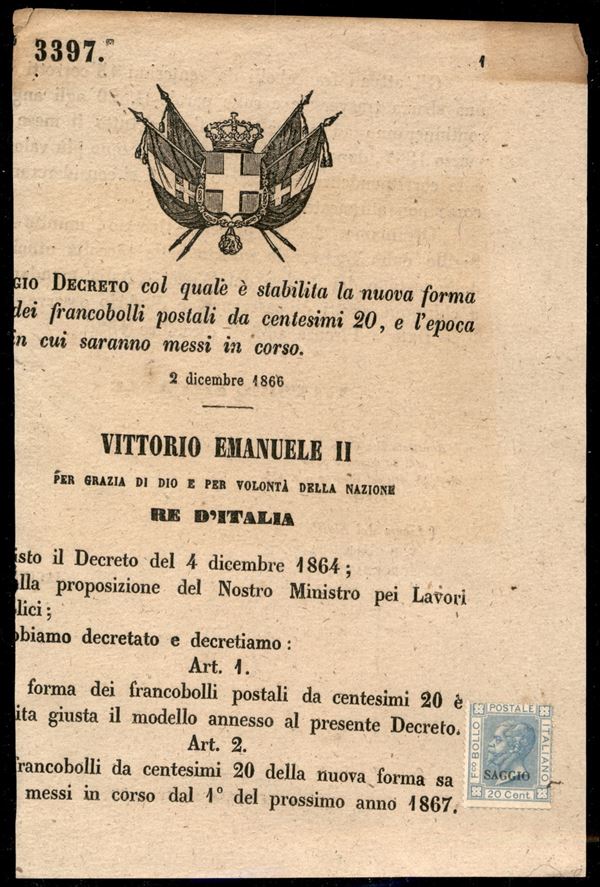 1867 - Saggio del 20 cent (T26) applicato su porzione del Regio Decreto