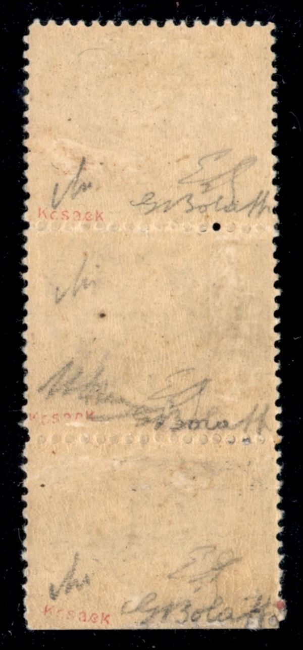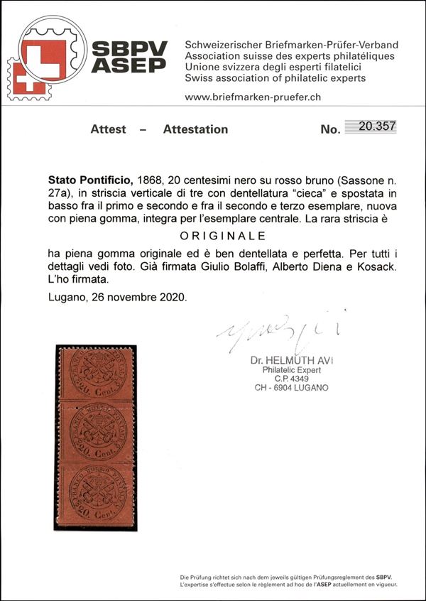 1868 - 20 cent rosso bruno (27o) - striscia verticale di tre con dentellatura orizzontale spostata non dentellata in basso (bordo foglio) - gomma originale - AM. Diena + Emilio Diena + G. Bolaffi + Cert. Avi